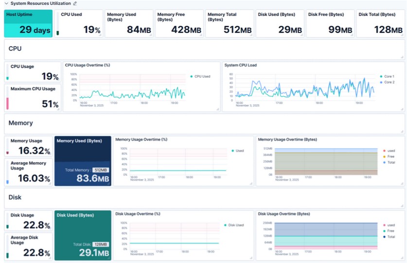 This section visualizes CPU, Memory, and Disk usage trends over time—vital for assessing system load and capacity planning.